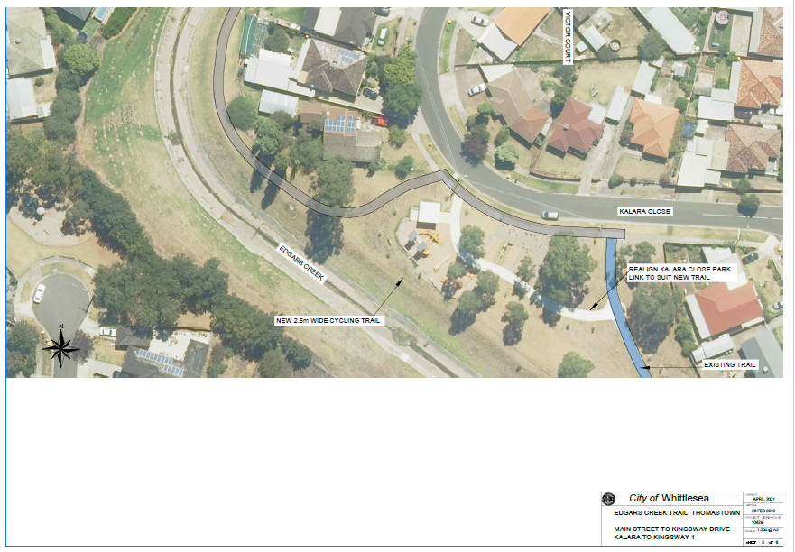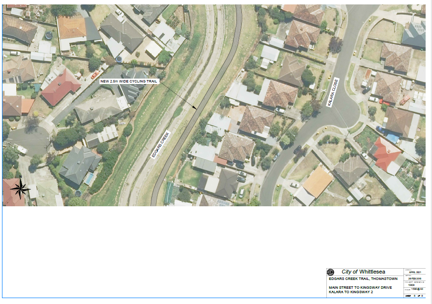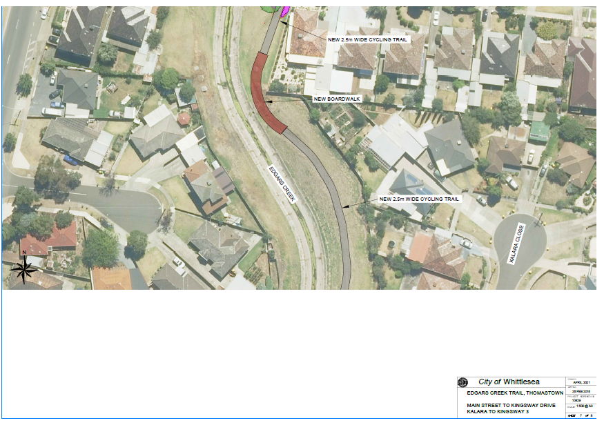 The Edgars Creek Trail is identified in both the Northern Trails Strategy (2016) and Whittlesea Bicycle Plan (2015) as a high priority cycling trail along Edgars Creek that, once complete, will run between the M80 Ring Road Trail in Thomastown and Craigieburn Road in Wollert. Council is working to build and maintain the Edgars Creek Trail as a major piece of our walking and cycling path network.